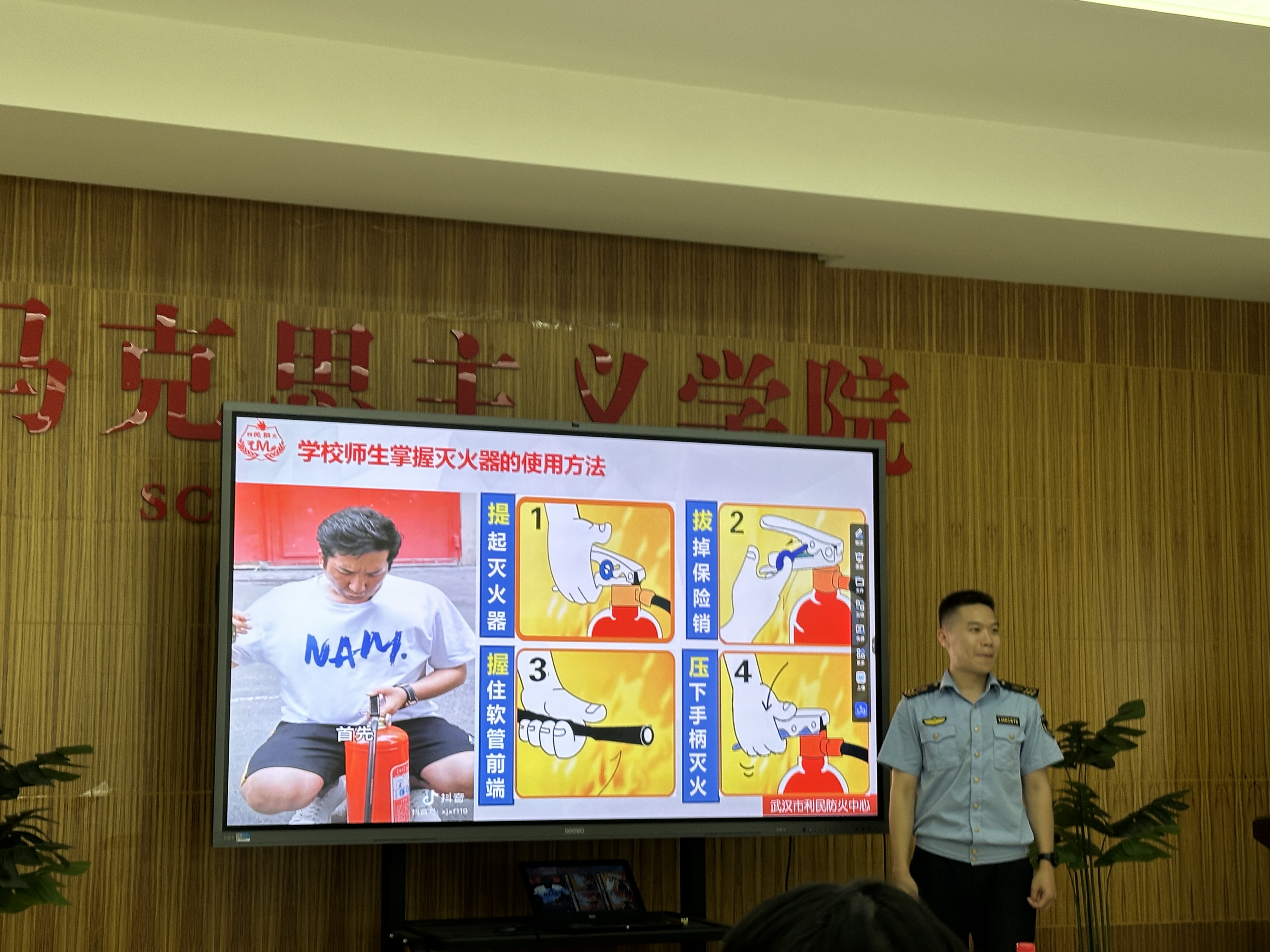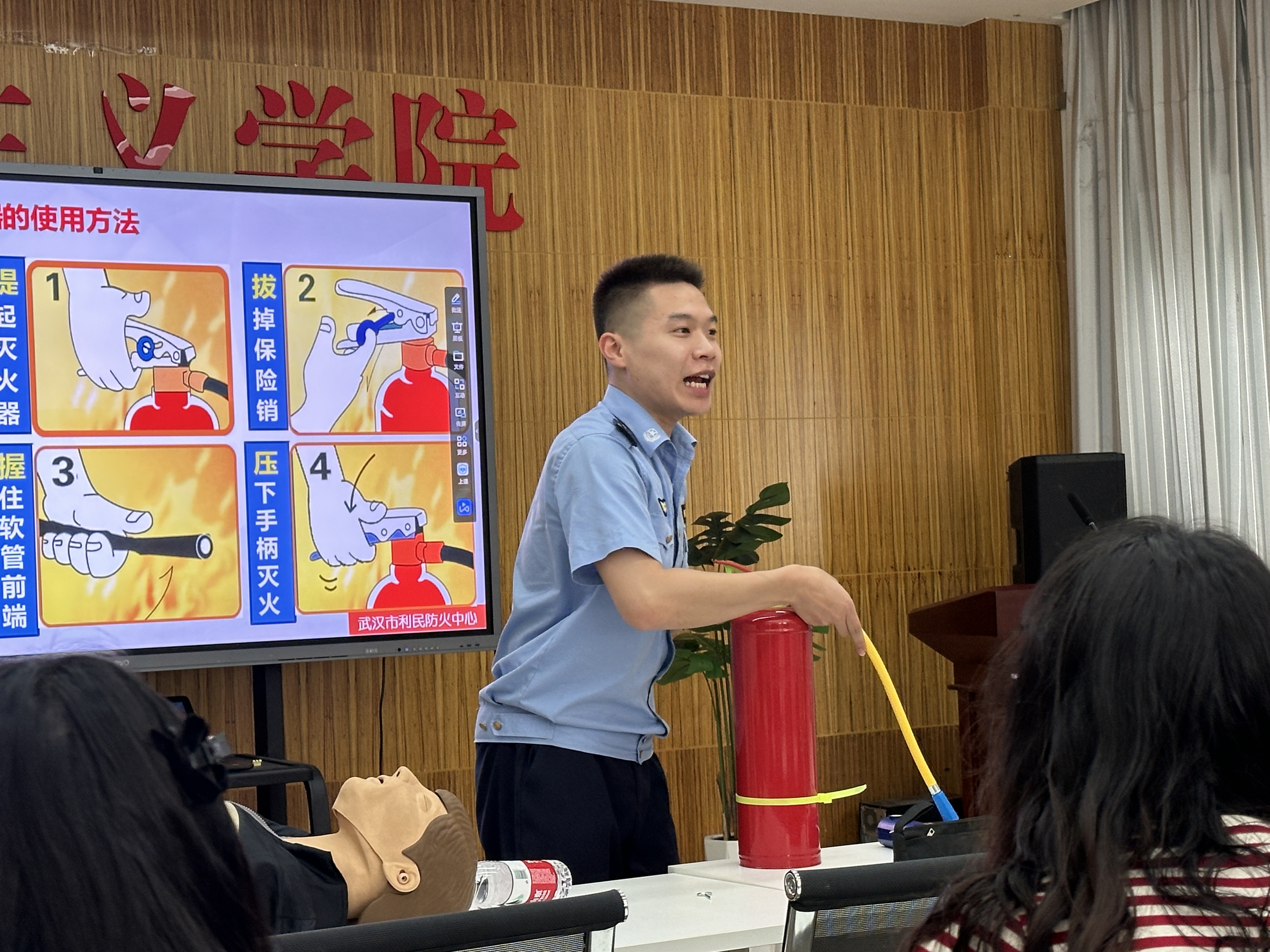 华智为教官演示灭火器的使用方法。